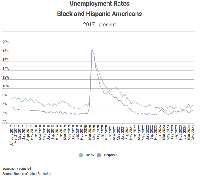 La tasa de desempleo de los negros era del 9.3% cuando Biden asumió el cargo y ahora es del 61% en mayo. Durante ese tiempo, alcanzó un mínimo histórico del 4.8% en abril de 2023. La tasa actual del 6.1% es la misma que la tasa prepandémica en febrero de 2020.