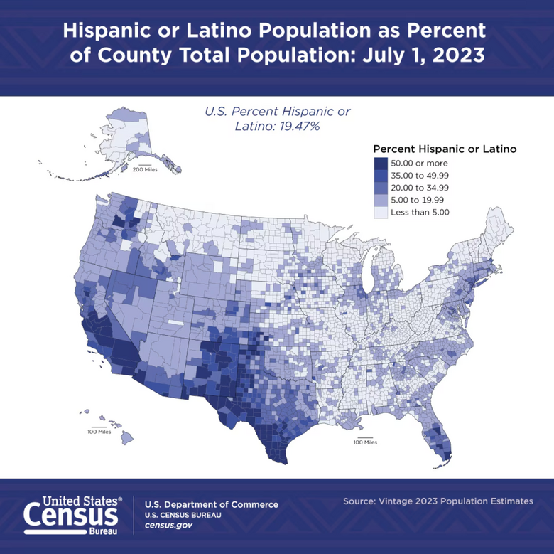 En términos porcentuales, los latinos representaban casi una quinta parte (19,5%) de la población estadounidense en 2023, consolidándose como el segundo grupo más grande después de los estadounidenses blancos no hispanos.