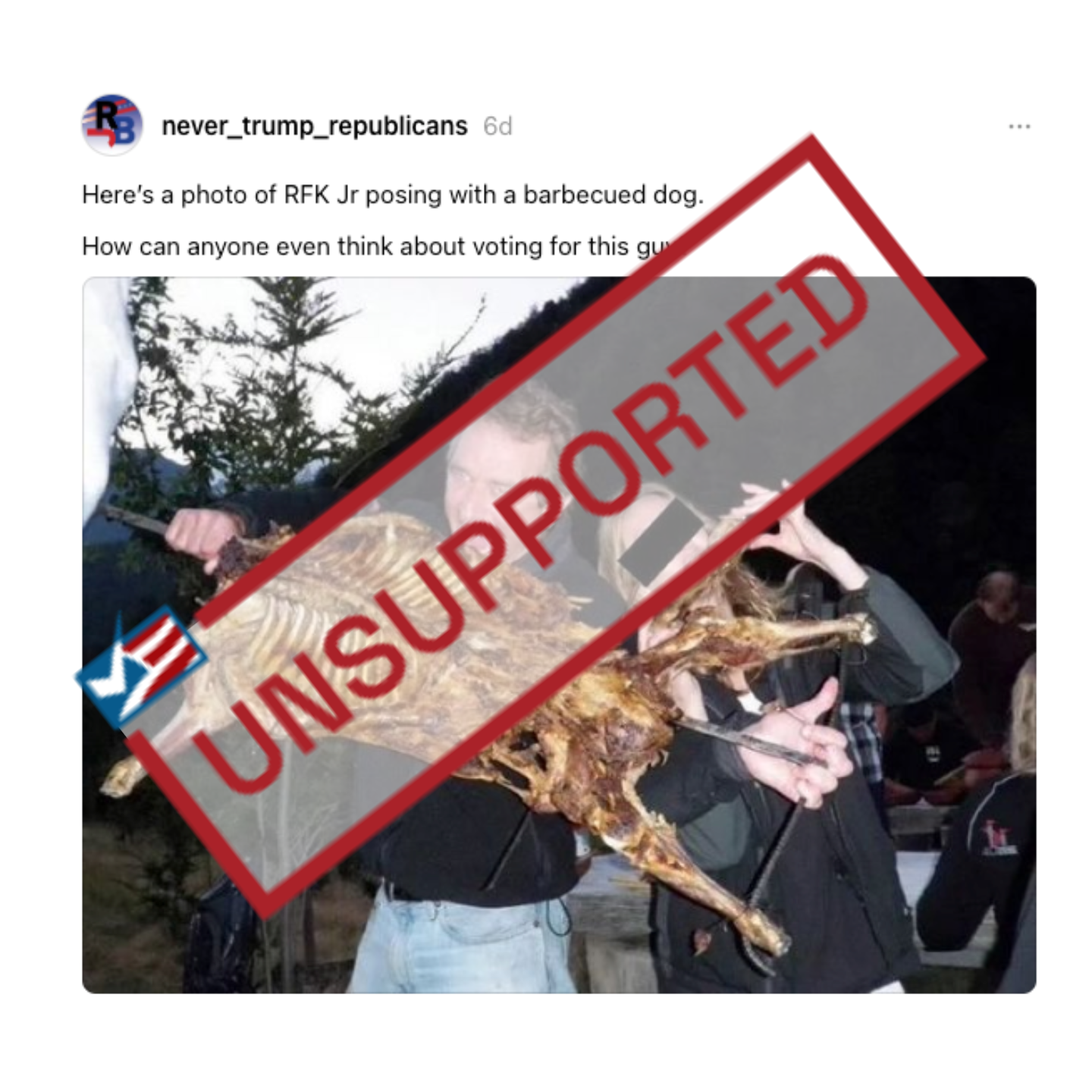 En las redes sociales siguen circulando varias publicaciones virales que afirman sin fundamento que Kennedy posó con el cadáver de un perro, a pesar de que Vanity Fair se retractó posteriormente. El texto que aparece sobre la foto en una publicación de Threads del 2 de julio decía: “Aquí hay una foto de RFK Jr posando con un perro asado a la parrilla. ¿Cómo puede alguien siquiera pensar en votar por este tipo?”.