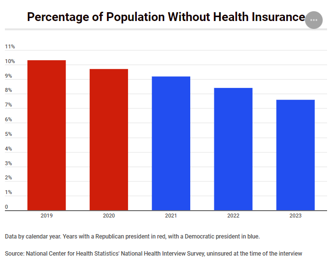 En 2023, el 7.6% de la población no tenía seguro, según las últimas estimaciones publicadas por el NHIS. Eso es menor que el 9.7% de 2020. En cifras brutas, el año pasado había 6.6 millones menos de personas sin seguro en comparación con el año anterior a que Biden se convirtiera en presidente.