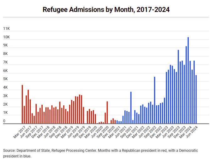 La administración admitió solo a 25.465 refugiados en el año fiscal 2022 y a 60.014 en el año fiscal 2023. En los primeros nueve meses del año fiscal 2024, Estados Unidos admitió a 68.291 refugiados, según datos del Departamento de Estado.