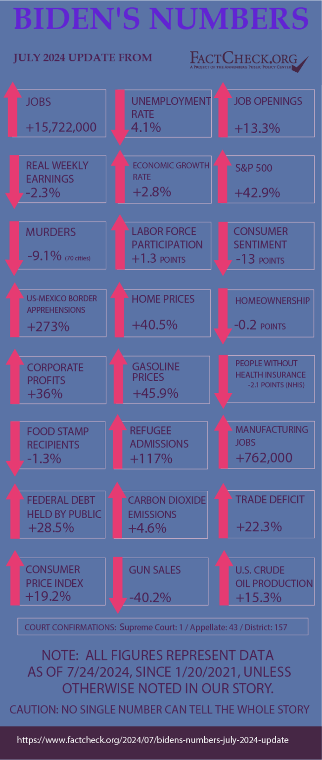 Nuestra última actualización trimestral de "Las cifras de Biden", que publicamos por primera vez en enero de 2022, llega días después de que Biden abandonara la carrera presidencial y respaldara a la vicepresidenta Kamala Harris. Publicaremos una actualización más en octubre, antes del Día de las Elecciones.