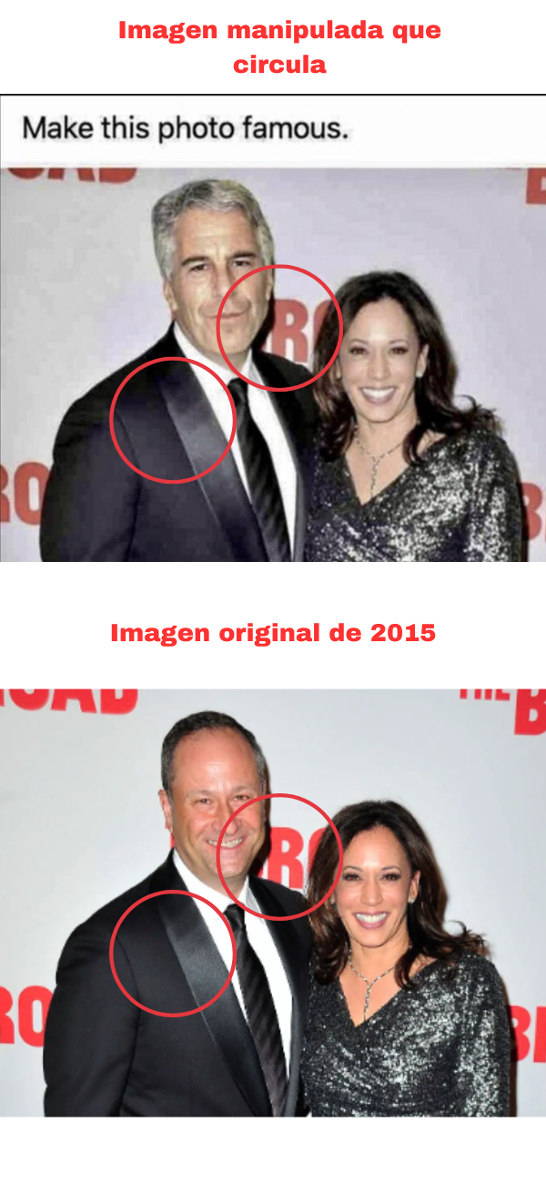 Así, la imagen que circula en la que se ve a la vicepresidenta de Estados Unidos, Kamala Harris, posando en una sesión de fotos (photocall) junto al condenado por tráfico de menores, Jeffrey Epstein, es un montaje. En la fotografía original, Harris aparece junto a su esposo en un evento de 2015 en Los Ángeles.