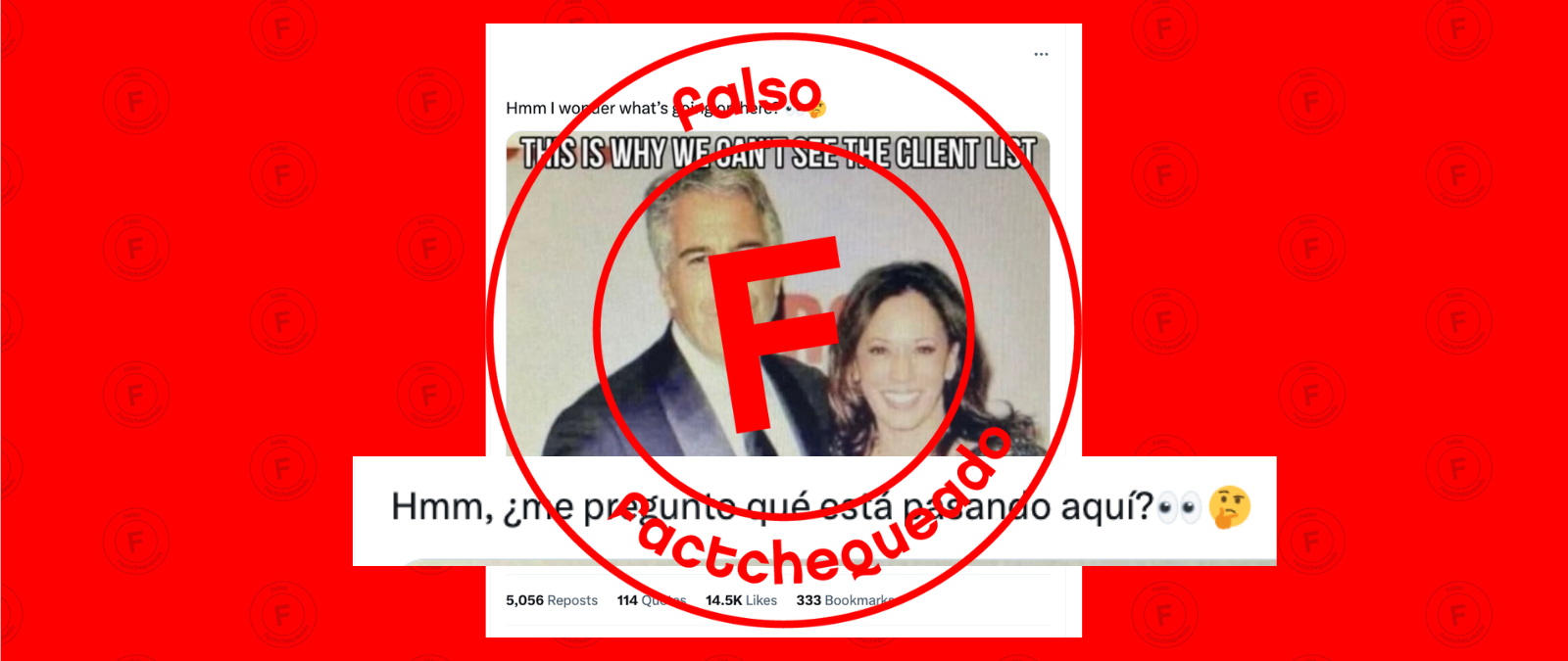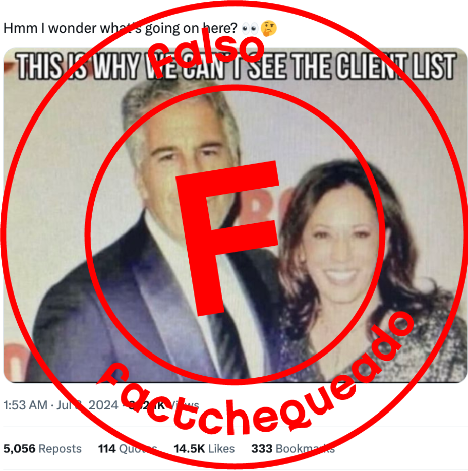 “Hmm, ¿me pregunto qué está pasando aquí?”, dice en inglés una publicación en X (antes Twitter) con más de 1.1 millones de vistas, donde aparece la actual vicepresidenta de Estados Unidos, Kamala Harris, junto al magnate Jeffrey Epstein, condenado por tráfico de menores, La difunden justo después de que Joe Biden renunciara a ser candidato por el Partido Demócrata en las próximas elecciones presidenciales y diera públicamente su apoyo a Harris para ocupar ese puesto. Sin embargo, se trata de un montaje de una foto de la política demócrata junto a su esposo sobre el que han colocado el rostro de Epstein.