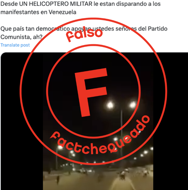 “Desde un helicóptero militar, disparan al pueblo venezolano”. Así titula un video que circuló en X el 29 de julio de 2024. Pero eso es falso. Cazadores de Fake News, medio de verificación venezolano, corroboró que el video, donde se observan ráfagas de fuego que vienen de arriba hacia abajo, fue grabado en 2016 en Turquía, durante un intento de golpe de estado.