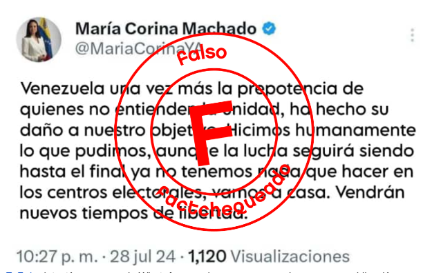 EsPaja detectó en grupos de WhatsApp una imagen que pareciera ser una publicación desde la cuenta de X (antes Twitter) oficial de María Corina Machado, líder de la oposición venezolana, pidiendo a sus seguidores que regresaran a sus casas, argumentando que la “prepotencia” de la coalición de partido de la oposición había “hecho daño al objetivo”. Eso es falso. EsPaja revisó la cuenta de Machado y esa publicación no aparece. En Factchequeado también revisamos la cuenta y las versiones archivadas y tampoco encontramos esa publicación.