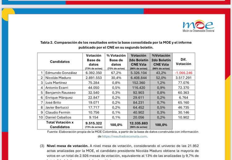 El pasado sábado la Misión de Observación Electoral (MOE) de Colombia compartió con la comunidad internacional los resultados preliminares de las elecciones presidenciales de Venezuela 2024. Esta entidad, que logró cubrir aproximadamente el 73% de las mesas de votación en todo el país, contabilizó 9.515.322 votos.