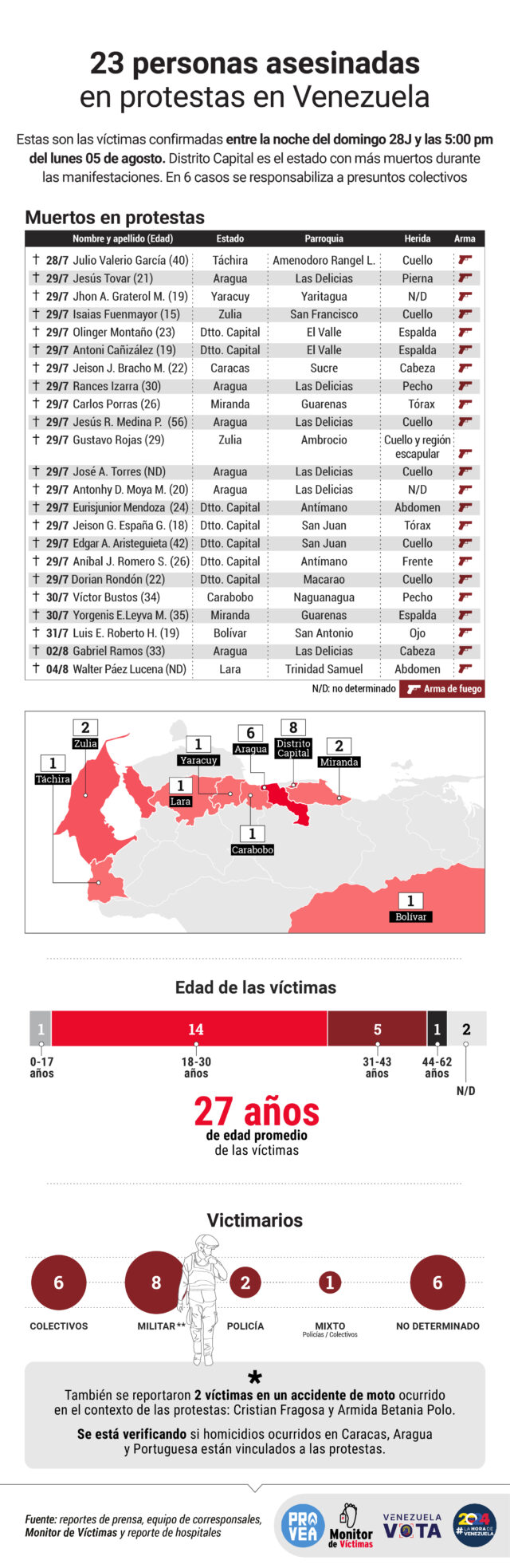 De acuerdo con datos recogidos por Monitor de Víctimas, en seis de las 23 muertes registradas no se sabe quién es el homicida. Los militares son los responsables en ocho casos y los colectivos en seis. Hay dos víctimas a manos de policías y una que murió por un tiroteo propiciado por uniformados y colectivos.