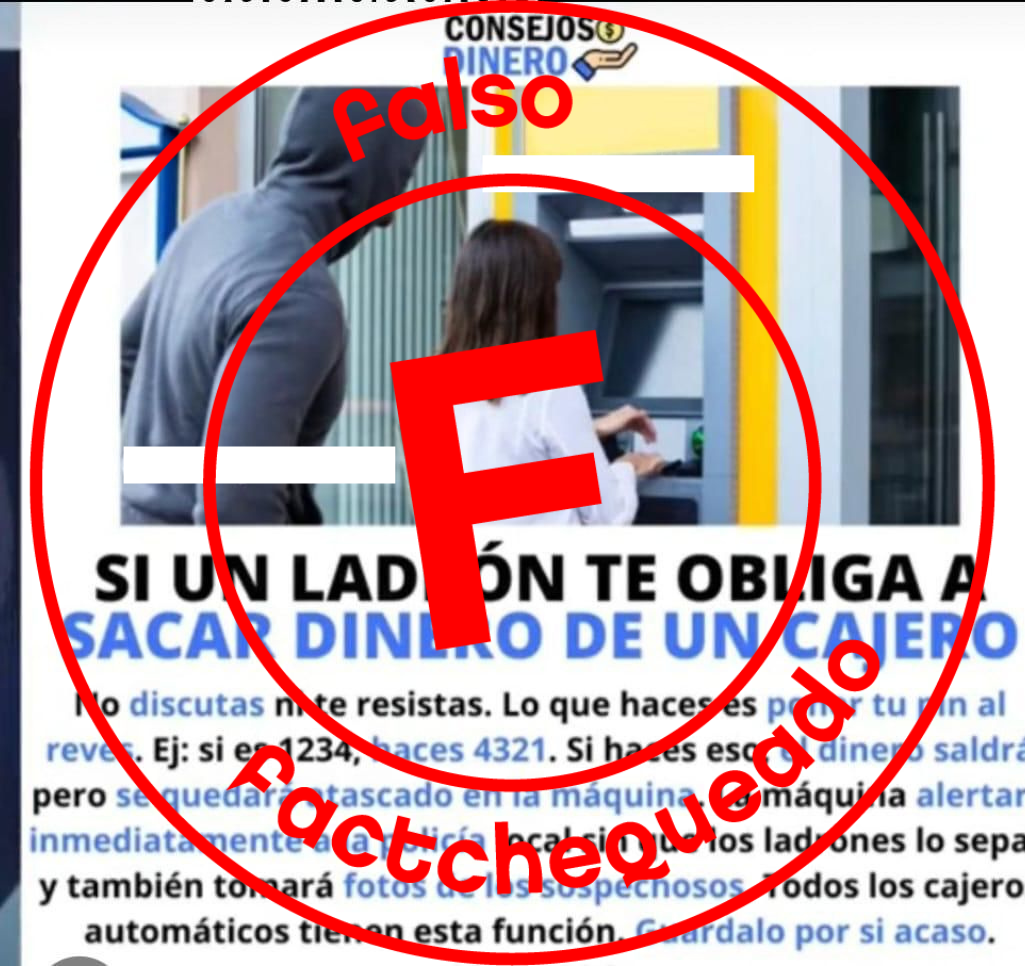 - Nos enviaron al WhatsApp de Factchequeado, una imagen en la que aseguran que, en caso de que un ladrón te esté obligando a sacar dinero de un cajero automático, puedes poner tu PIN al revés y esto hará que el dinero se atasque, la policía local sea notificada y también se tomen fotos de los sospechosos. Pero esto es falso.