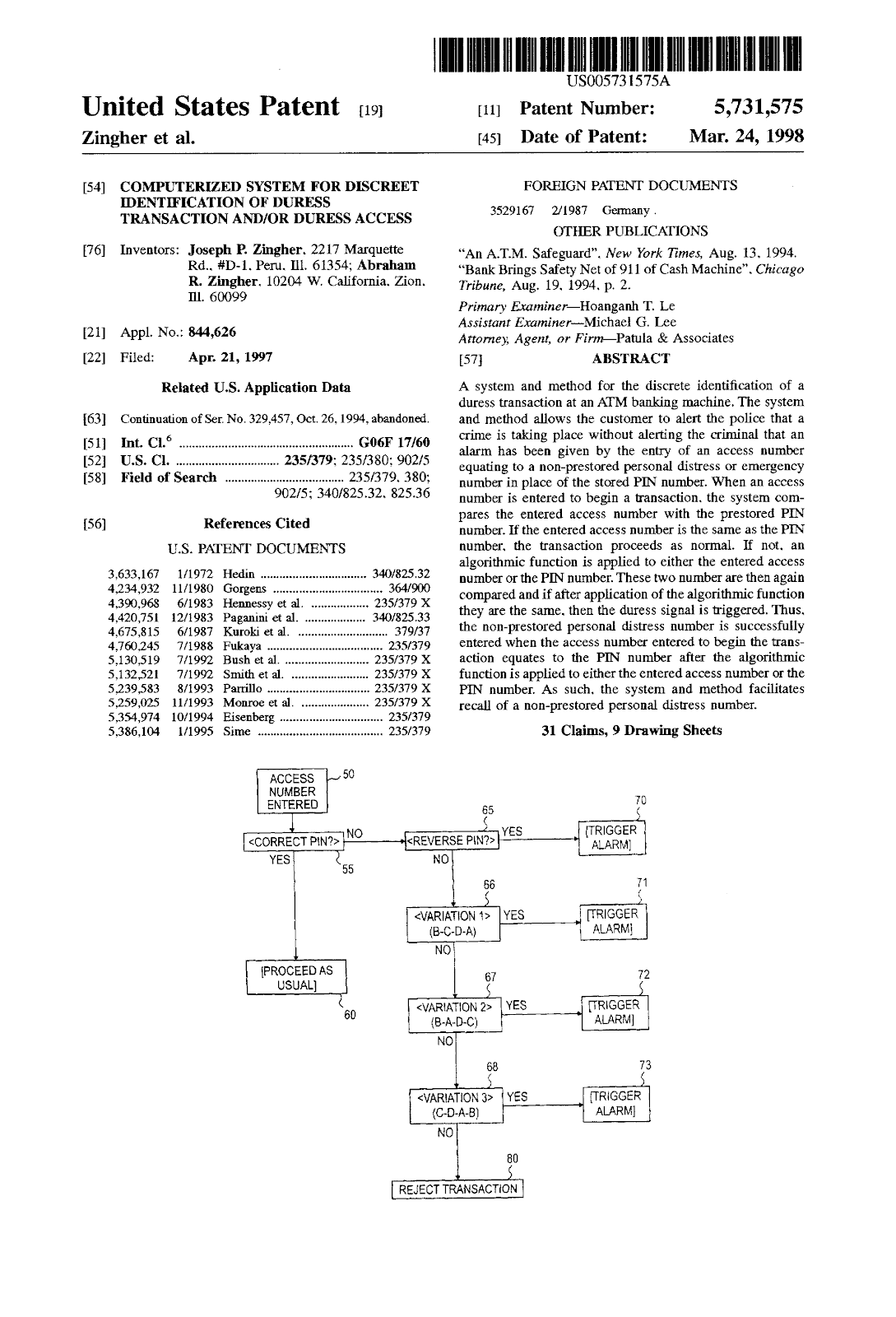 Un reporte de 2010 de la Comisión Federal de Comercio (FTC, por sus siglas en inglés) señala que “un sistema de PIN en reversa (reverse-PIN system) llamado ‘SafetyPin’ fue inventado por Joseph Zingher y patentado en marzo de 1998”. Se trataba de un “código simple de computadora que podría reconocer [PINs] invertidos, o alterados de otro modo como una señal de socorro y [ordenaría] al cajero que llame a la policía”.