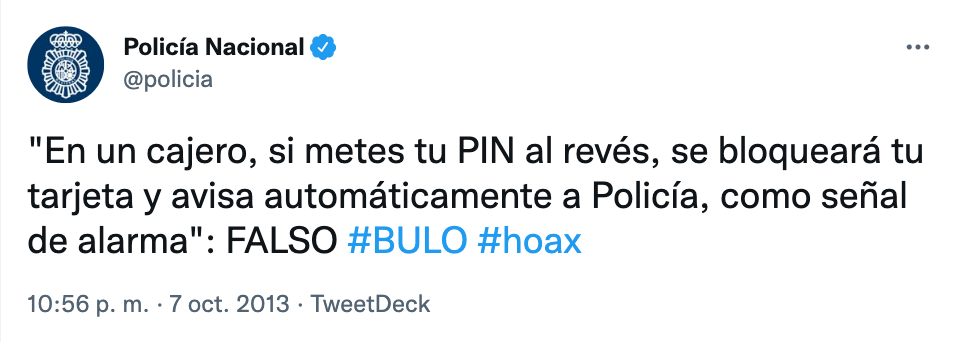 “Si un ladrón te obliga a sacar dinero de un cajero. No discutas ni te resistas. Lo que haces es poner tu pin al revés. Ej: si es 1234, haces 4321. Si haces eso, el dinero saldrá pero se quedará atascado en la máquina. La máquina alertará inmediatamente a la policía local sin que los ladrones lo sepan y también tomará fotos de los sospechosos. Todos los cajeros automáticos tienen esta función. Guardalo por si acaso.”(sic)