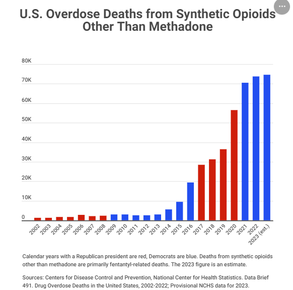 Las muertes por sobredosis de opioides sintéticos distintos de la metadona han ido aumentando durante varios años, incluso durante la administración Trump. Las muertes estimadas para 2021-2023 son aproximadamente un 44% más altas que las 152.676 muertes durante los cuatro años de Trump como presidente, y el total bajo el gobierno de Trump había aumentado aproximadamente un 306% con respecto a las 37.642 muertes durante los últimos cuatro años de Barack Obama como presidente.