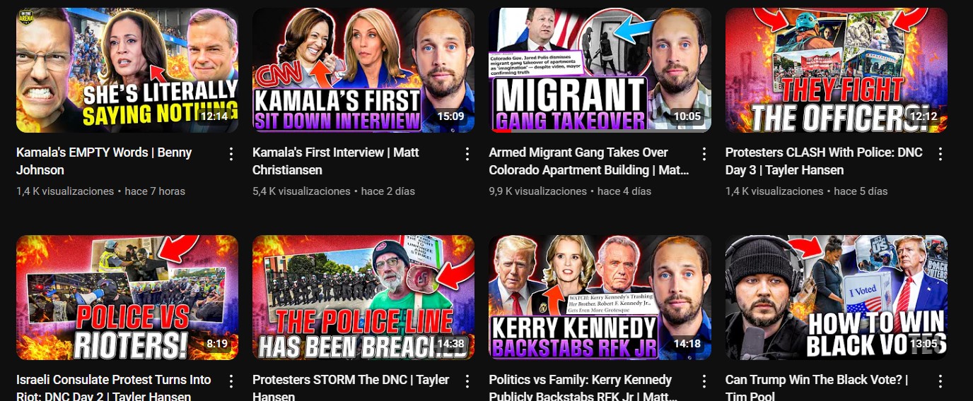 En sus decenas de videos publicados en su canal de Youtube, destacan algunos con títulos como “Las palabras vacías de Kamala”; “Disturbios en la Convención Nacional Demócrata: ¿Alguien se sorprende?”; “Mientras Biden pide proteger el aborto, la inflación hace que las clínicas cierren”, entre otros.