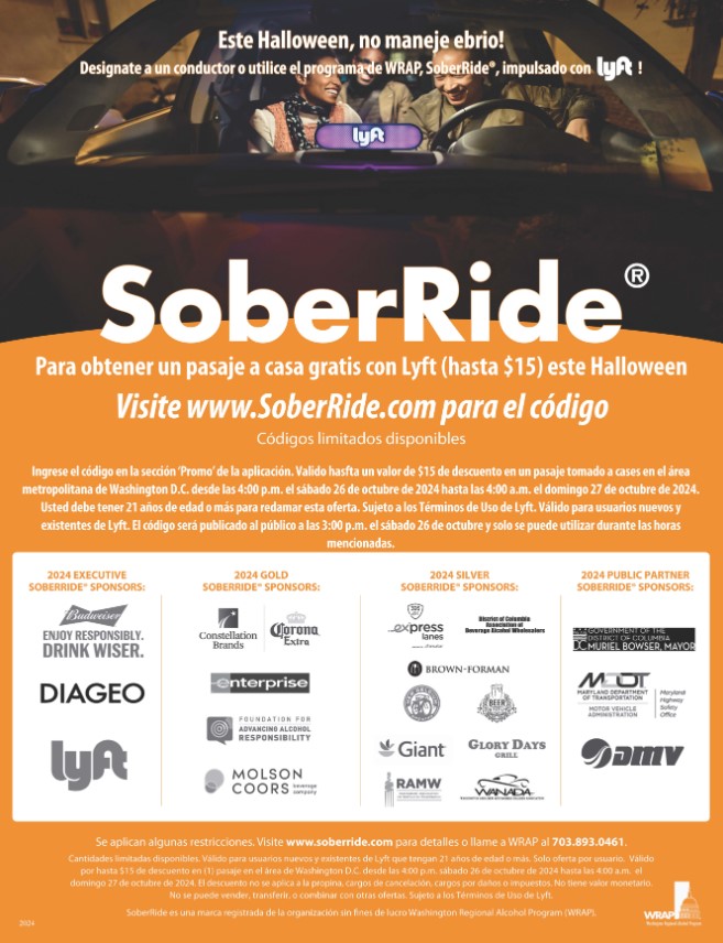 Esta iniciativa, denominada Halloween SoberRide 2024 y ofrecida por el Programa Regional de Alcohol de Washington (WRAP), se llevará a cabo desde las 4:00 pm del sábado 26 hasta las 4:00 am del domingo 27 de octubre.