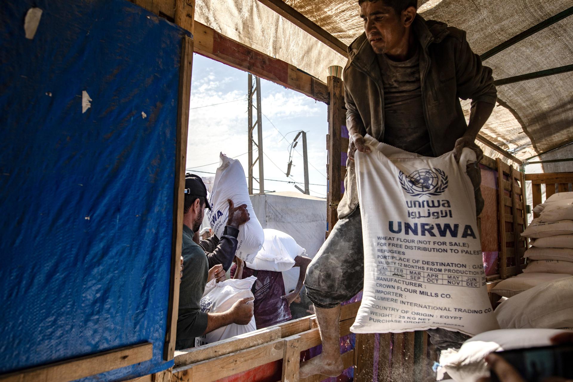Unas imágenes muestran a un palestino en Deir al Balah, en el centro de Gaza, llevando una bolsa de harina distribuida por la UNRWA, lo que pone de relieve el papel vital de la agencia en el suministro de ayuda humanitaria a las zonas necesitadas.
