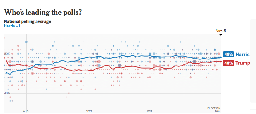 Según datos de la página de polls de The New York Times, a nivel nacional, Kamala Harris está superando a Donald Trump –en este momento– por apenas un punto porcentual (49% frente al 48%).