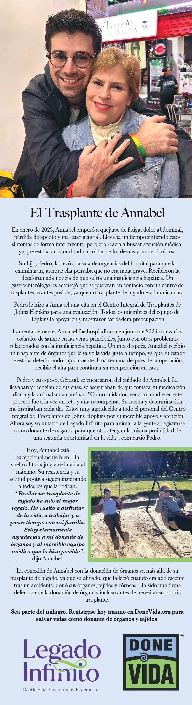 Pedro y su esposo, Géraud, se encargaron del cuidado de Annabel. La llevaban y recogían de sus citas, se aseguraban de que tomara su medicación diaria y la animaban a caminar. "Como cuidador, ver a mi madre en este proceso fue a la vez un reto y una recompensa. Su fuerza y determinación me inspiraban cada día. Estoy muy agradecido a todo el personal del Centro Integral de Trasplantes de Johns Hopkins por su increíble apoyo y atención. Ahora soy voluntario de Legado Infinito para animar a la gente a registrarse como donante de órganos para que otros tengan la misma posibilidad de una segunda oportunidad en la vida", compartió Pedro.