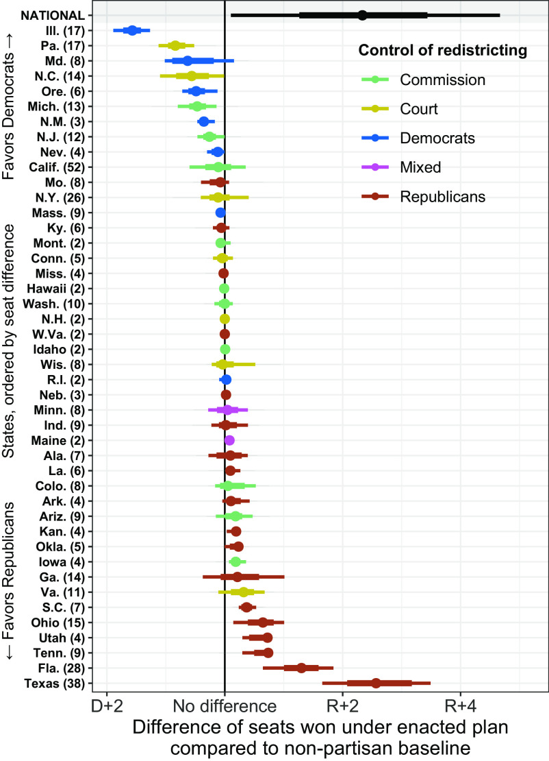 En general, encontraron que estos mapas partidistas generaron 23 escaños adicionales para los republicanos en comparación con siete para los demócratas, una ventaja neta de 16 escaños para el Partido Republicano.