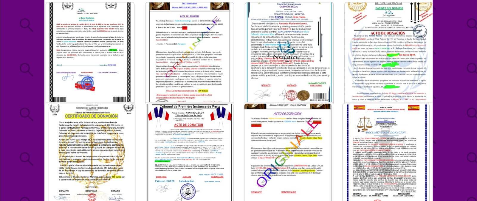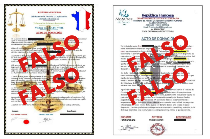 La Embajada de Francia en Guatemala publicó en su página web (archivado aquí) una alerta frente a estafas que utilizan documentos de donación falsos. Los documentos falsos que muestran son similares a los que nos enviaron al WhatsApp de Factchequeado: comienzan con la frase “acto de donación” y están principalmente escritos en español.