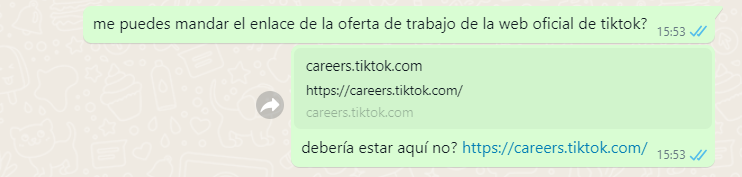 Nos preguntaron también a nuestro chatbot por una supuesta oferta de trabajo que afirma ser del departamento de promoción de TikTok. “Estamos buscando reclutar a 5,000 empleados a tiempo parcial”, indica el mensaje, que destaca que “el trabajo es muy sencillo y no tiene restricciones de tiempo”. Pero es un caso de phishing, no se trata de una oferta de trabajo real.