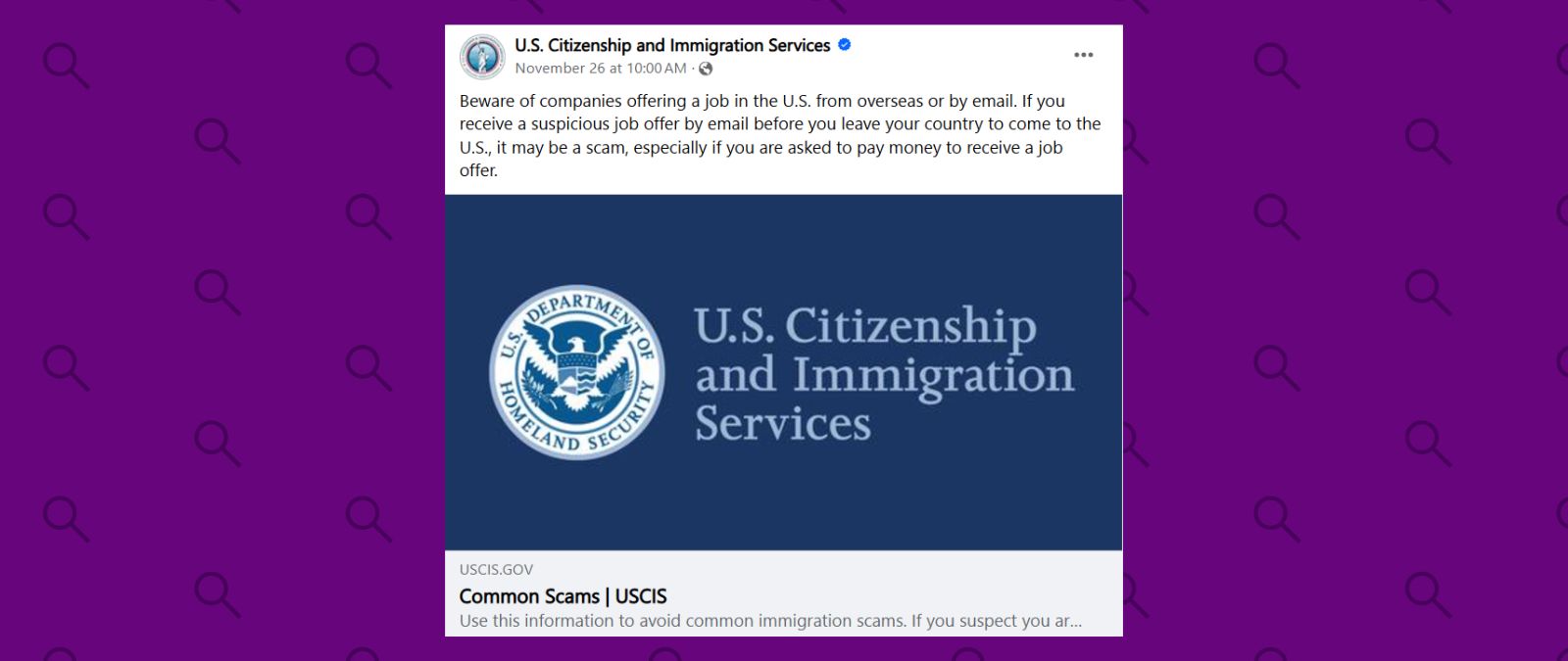 El Servicio de Ciudadanía e Inmigración (USCIS, por sus siglas en inglés) alertó el 16 de noviembre de 2024 a través de su cuenta en Facebook sobre ofertas de trabajo sospechosas para ir a Estados Unidos. Podría tratarse de estafas.