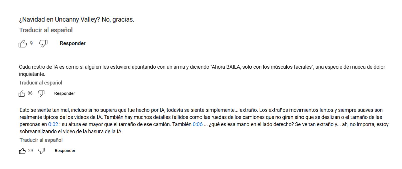 Este año, dos de los anuncios navideños de Coca-Cola causaron revuelo. A pesar de incluir las figuras de siempre (Papá Noel, osos polares, renos y camiones de la marca), algo había cambiado: los videos habían sido creados con inteligencia artificial (IA) y eso lo explicitaba la compañía. “Esto es tan reconfortante como un árbol de aluminio” o “cero azúcar, cero alma” son algunos de los comentarios que podemos encontrar en las publicaciones (uno de los videos ahora está en oculto en YouTube). Algunas críticas se centran en la incomodidad que generan las figuras humanas creadas con IA (algo conocido como valle inquietante o uncanny valley) y en la decisión de crear todo con IA y prescindir de algunos trabajadores.