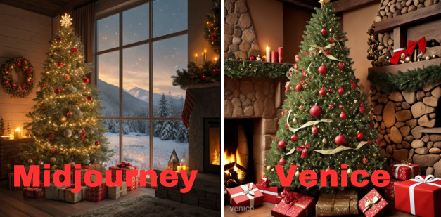 También a través de Easy.peasy.AI pudimos crear una imagen con el modelo de Midjourney: el prompt de siempre arrojó una imagen hiperrealista del salón de un hogar, con un árbol de Navidad, regalos, guirnaldas, una chimenea, un paisaje nevado de fondo y ninguna figura humana. Algo similar representó Venice: un árbol, una chimenea y regalos en un salón. Todo siguiendo el mismo patrón.