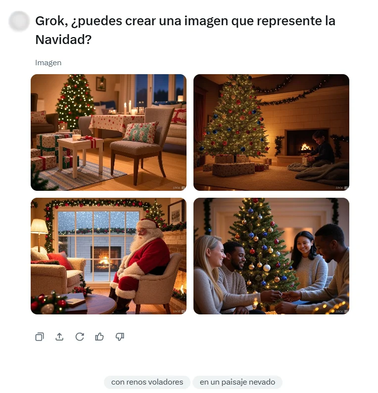 El generador de imágenes de Grok, la IA de X (antes Twitter), se ha usado para crear todo tipo de contenido controvertido, como imágenes de deportistas en situaciones racistas, xenófobas y asociadas al nazismo, así como otras violentas, vejatorias y sexualizadas de políticos y personas famosas. Pero para este experimento, la petición ha sido la siguiente: Grok, ¿puedes crear una imagen que represente la Navidad?
