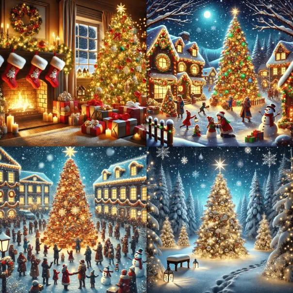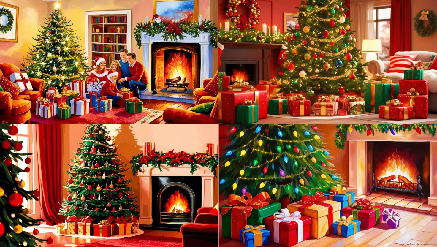 - La mayoría de los resultados están ambientados en salones con chimenea llenos de decoraciones navideñas (lo que evidencia que se trata de celebraciones en países del norte) y no incluyen figuras humanas. Otras imágenes muestran paisajes nocturnos nevados con árboles gigantes.