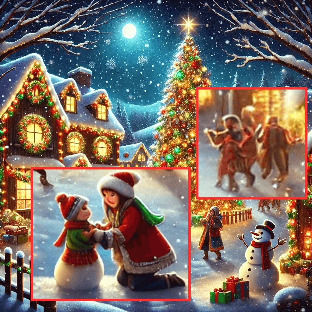 Dall-E tampoco ha sido preciso representando a los humanos. En la segunda imagen podemos ver algunas figuras con abrigos y gorros navideños, pero todos los rostros están deformados. También hay un niño cuya parte de abajo parece ser de hombre de nieve y algunas figuras del fondo se confunden entre ellas.