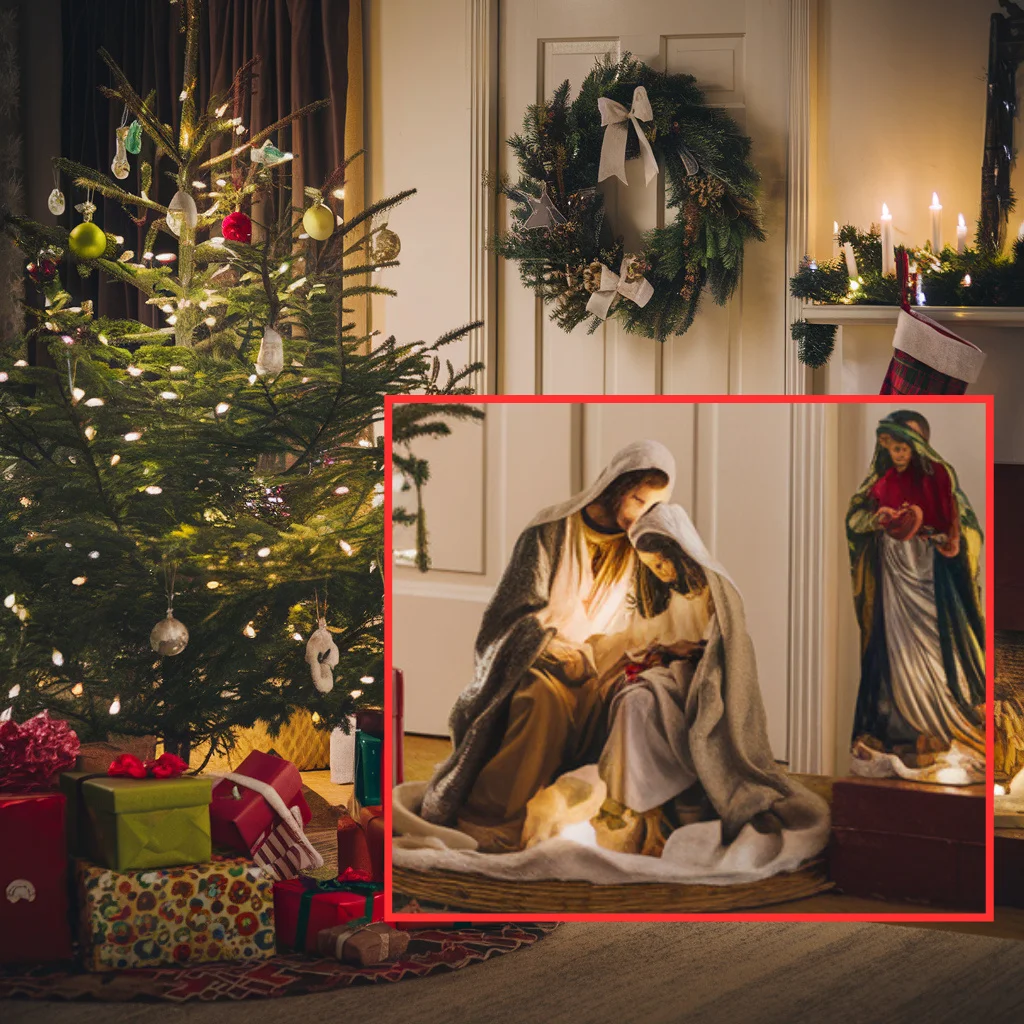 En internet hay muchas herramientas gratuitas que permiten crear imágenes con IA, así que se experimentó con el mismo prompt en algunas menos conocidas. Ideogram creó 8 imágenes bastante similares con ninguna persona a la vista. Todas incluyen árboles de Navidad y la mayoría están ambientadas en un salón. Hasta aquí lo de siempre. Pero en una de ellas, por primera vez, vemos lo que parece ser un belén (o pesebre navideño) con rostros deformes, el primer y único símbolo religioso de todo este experimento.
