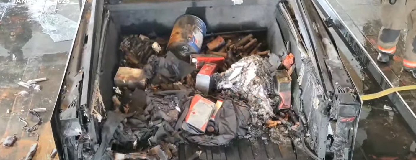 - En la parte trasera del vehículo se encontraron cilindros de gas, bidones de combustible y morteros de fuegos artificiales, según el sheriff Kevin McMahill, del Departamento de Policía Metropolitana de Las Vegas. Los investigadores también hallaron en el Cybertruck tarjetas de un hombre que sirvió en el ejército.