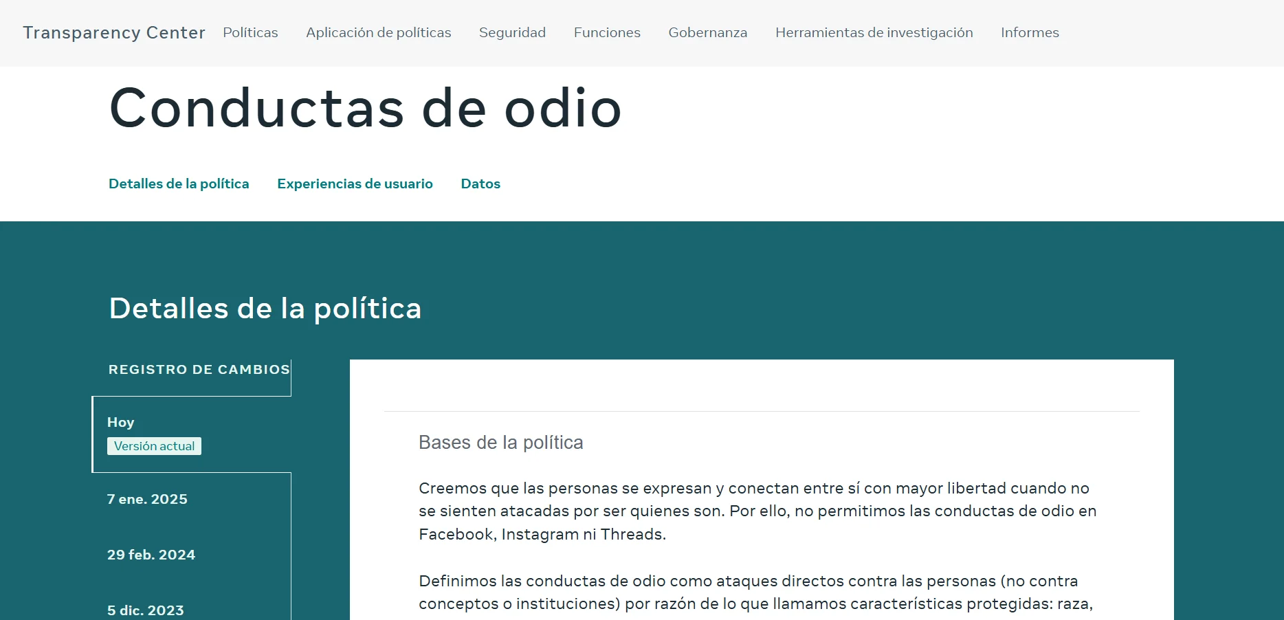 Estos cambios se plasmaron el 7 de enero de 2025 en una nueva versión de la política de “Conductas de odio” en inglés, donde se puede ver sombreado en verde lo que se ha añadido y tachado en rojo lo que ha sido eliminado. Posteriormente se ha incluido una versión actualizada en español.