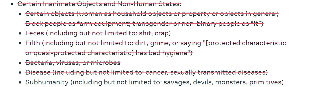 Se puede describir a las mujeres como objetos y a las personas trans o no binarias como “eso”: se eliminó la restricción de comparar personas con objetos inanimados, como, por ejemplo, llamar a “las mujeres como objetos del hogar o propiedades u objetos en general, las personas transgénero o no binarias como ‘eso’”. También se ha quitado la prohibición de compararlas con heces, suciedad, bacterias, enfermedades y primitivos.