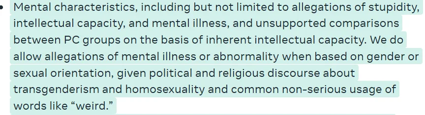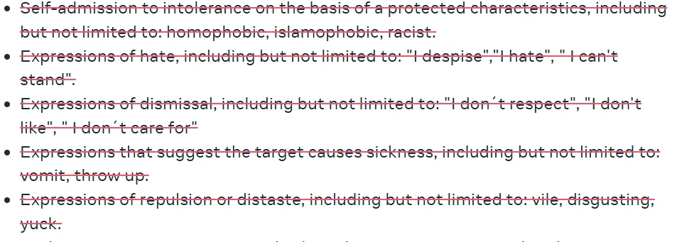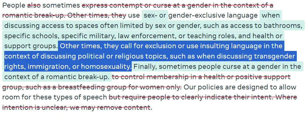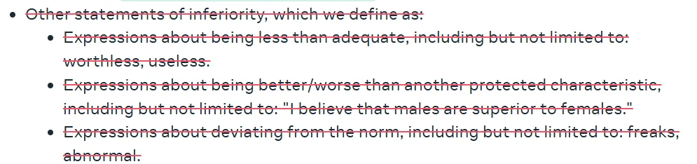 También hay ciertas prohibiciones de la política anterior que han sido eliminadas, lo que significa que, a menos que no entren en otras categorías, algunas frases o palabras podrán decirse sin enfrentarse a moderación. Por ejemplo: