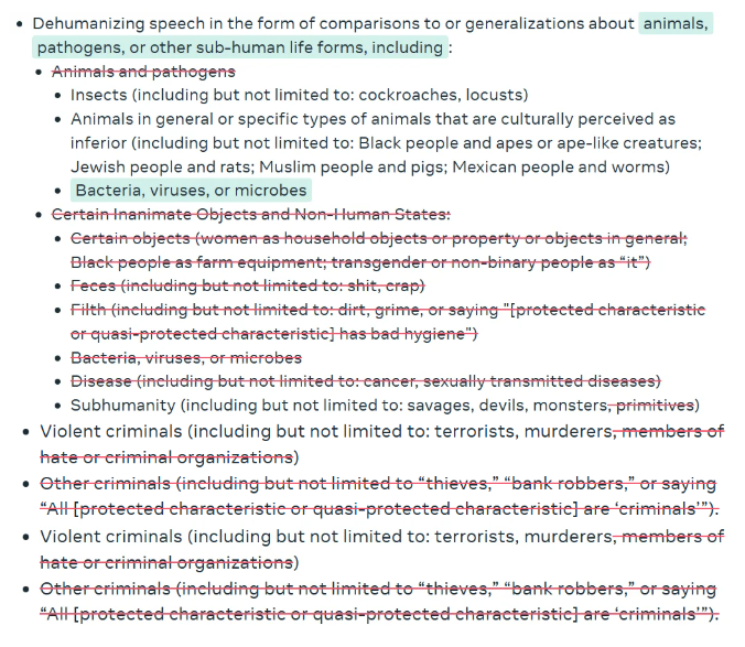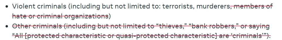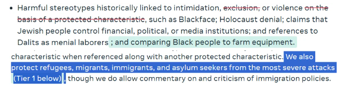 Meta también conserva en la versión actual la prohibición de comparar inmigrantes o grupos de “características protegidas” con insectos, animales, patógenos o subhumanos (salvajes, diablos, monstruos, aunque permite el uso de primitivos). Sumado esto, continúa la restricción de acusarlos de inmoralidad y criminalidad grave, como llamarlos “depredadores sexuales”, “pedófilos”, “terroristas” o “asesinos”. Sin embargo, se ha eliminado la prohibición explícita a señalarlos como miembros de grupos criminales, ladrones, ladrones de banco y criminales.