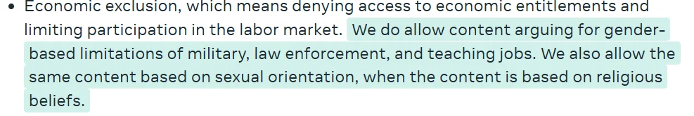 Decir que las mujeres o personas de la comunidad LGTBQ+ tengan limitaciones para ser militares o enseñar: un nuevo apartado permite “el contenido que abogue por las limitaciones de acceso a puestos de trabajo en cuerpos militares, fuerzas y cuerpos de seguridad, y el sector educativo en función del género. También permitimos este tipo de contenido en función de la orientación sexual, cuando este se basa en creencias religiosas”.
