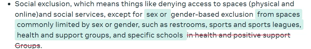 Afirmar que un baño, escuela, función militar, policial o docente es sólo para mujeres u hombres: nuevas frases señalan que “las personas emplean un lenguaje exclusivo de un sexo o género específico al debatir sobre el acceso a espacios que suelen limitarse conforme al sexo o al género, por ejemplo, el acceso a baños, escuelas concretas, cuerpos militares específicos, fuerzas y cuerpos de seguridad o empleos en el sector educativo, y grupos de salud o apoyo”. Antes, esta excepción sólo aplicaba a mantener los grupos de salud y apoyo limitados a un género.