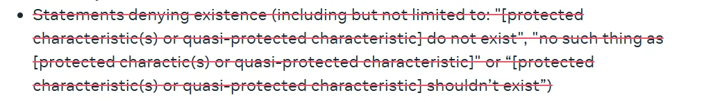 Se puede publicar que un grupo de personas no existe o no debería existir: similar a lo anterior, se ha eliminado la restricción específica a decir, por ejemplo, que una raza o afiliación religiosa no debería existir o negar la existencia de una orientación sexual.