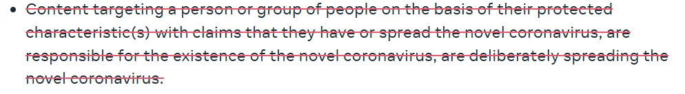 Se puede decir que un grupo de personas son responsables, tienen o propagan el COVID-19: se ha eliminado el apartado que prohibía atacar a personas “en función de sus características protegidas con afirmaciones de que tienen o propagan el nuevo coronavirus, son responsables de la existencia del nuevo coronavirus o están propagando deliberadamente el nuevo coronavirus”. La revista Wired pone como ejemplo decir que “las personas chinas tienen responsabilidad por la pandemia del COVID-19.