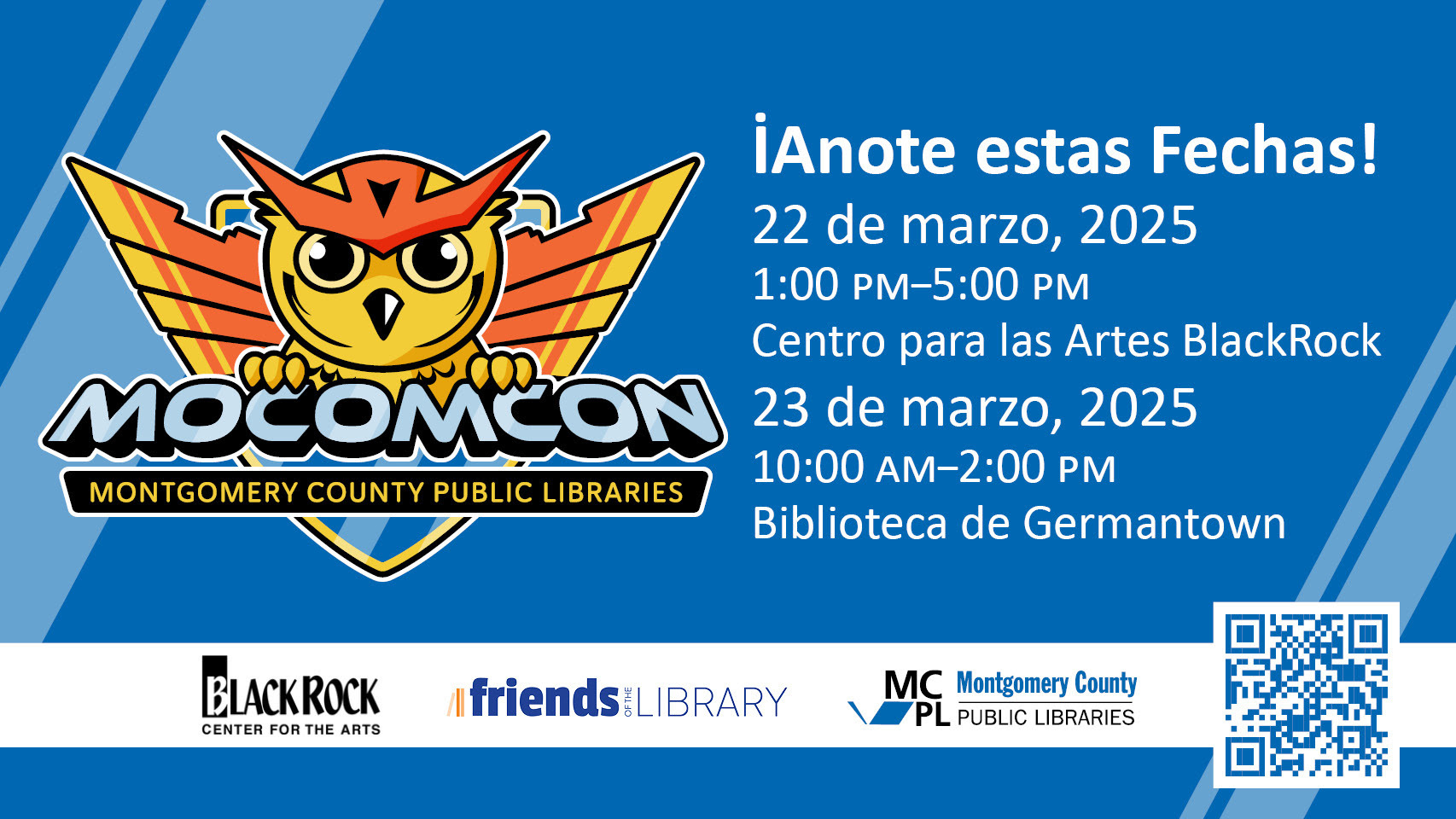 MoComCon es posible gracias al generoso apoyo de Friends of the Library, Montgomery County y de BlackRock Center for the Arts. El evento está comprometido a fomentar un entorno seguro y acogedor para todos, con asistencia disponible para quienes lo necesiten.