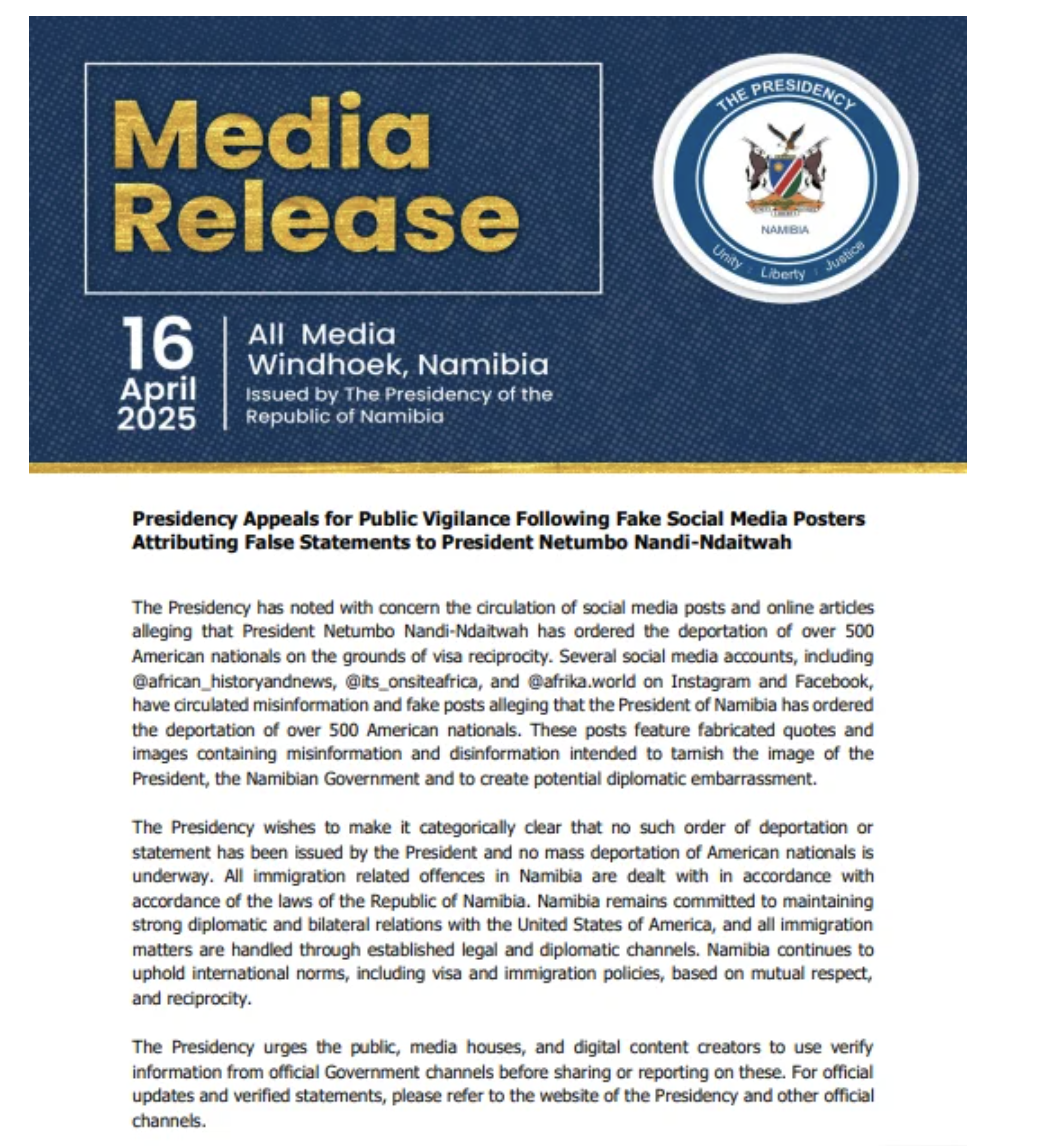 El 16 de abril de 2025, el Gobierno de Namibia emitió un comunicado sobre los contenidos desinformantes de redes sociales y webs sobre las supuestas 500 deportaciones de ciudadanos estadounidenses: “Estas publicaciones contienen citas e imágenes inventadas que contienen información errónea y desinformación con el objetivo de empañar la imagen de la presidente y del Gobierno namibio, y de crear una posible situación diplomática embarazosa”.