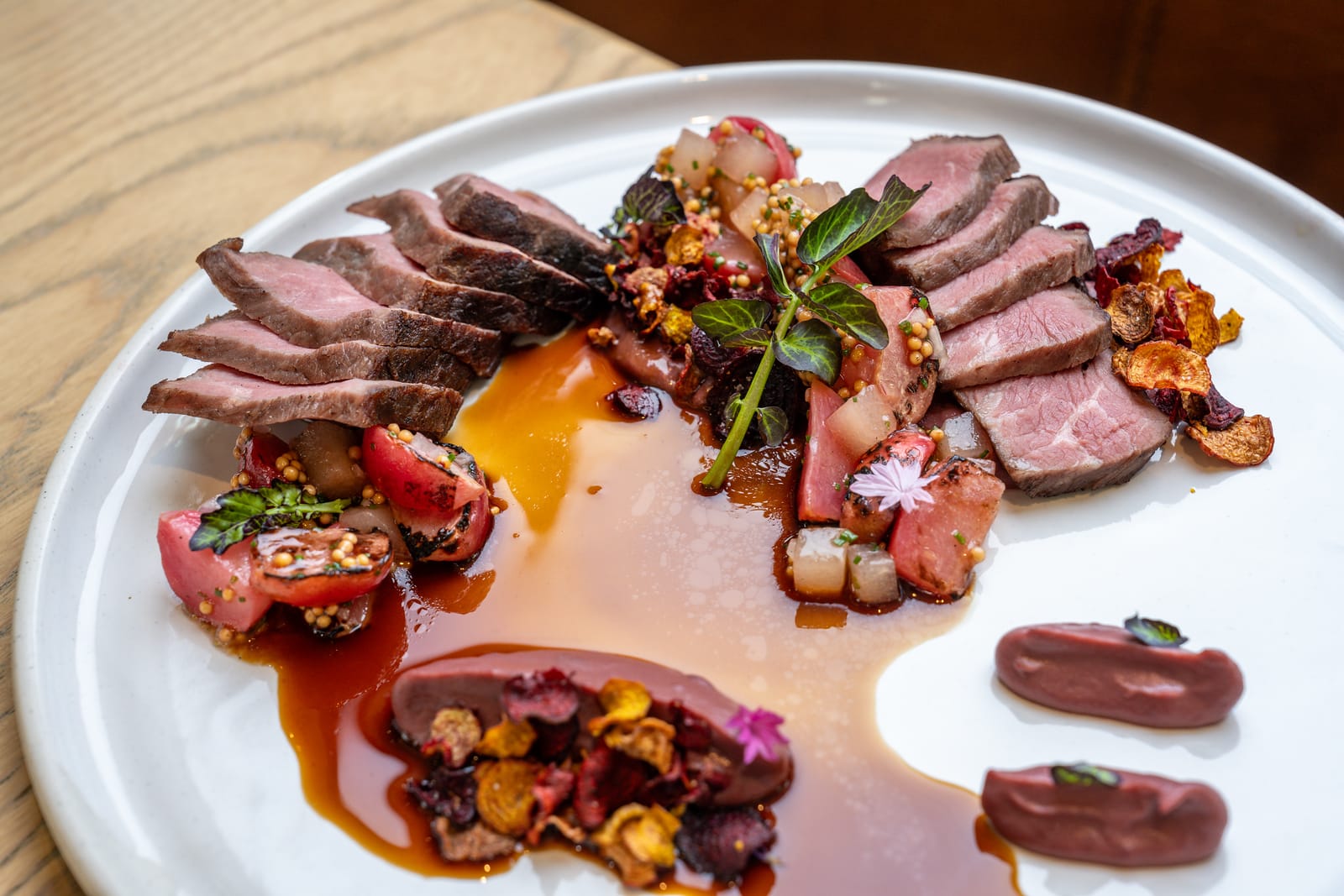 El menú de degustación del chef incluye seis tiempos ($98 por persona), con opciones "pescatarian" y vegetarianas, destacando creaciones como Gazpacho de Tomate Cherry, Espárragos Blancos a la Parrilla con salsa cava beurre blanc y huevas de trucha, Arroz de Hongos “Socarrat”, Costillar de Cordero con cuajada de leche de cabra y, de postre, Pan con Chocolate con helado de aceite de oliva.