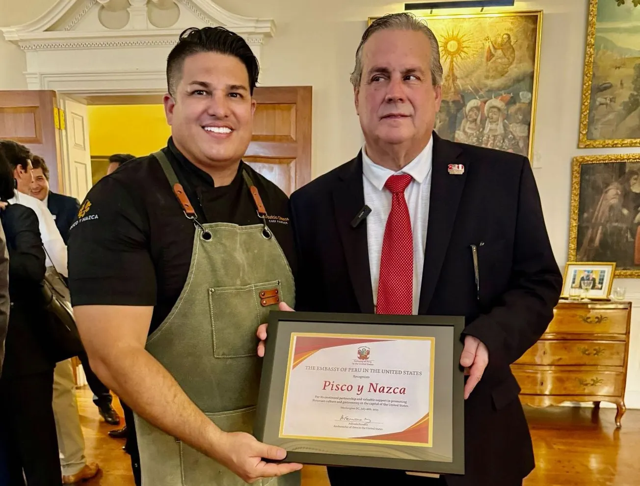 El reconocimiento fue recibido por el chef ejecutivo de la sede en Washington, DC, Mauricio Chirinos, quien expresó su gratitud al embajador Alfredo Ferrero, durante una recepción oficial llevada a cabo en la residencia del embajador en la capital.