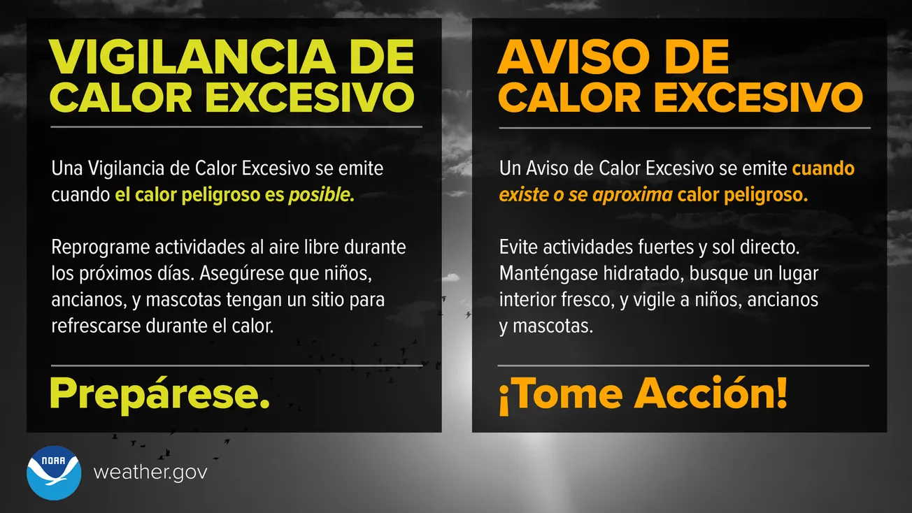 - El Servicio Meteorológico Nacional (NWS, por sus siglas en inglés) emite tres alertas por calor: vigilancia de calor extremo (extreme heat watch, en inglés), aviso de calor extremo (extreme heat warning) y advertencia de calor (heat advisory).
