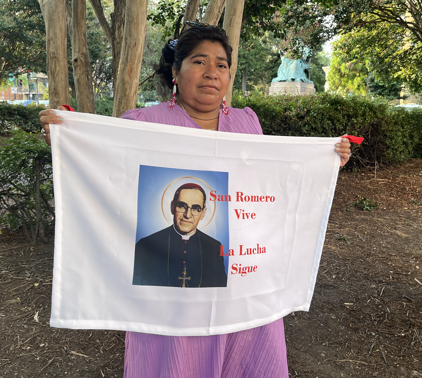 Cargando un estandarte con la cara de San Romero, Miranda honró el mensaje del arzobispo, diciendo que “si él luchó, nosotros también podemos”.