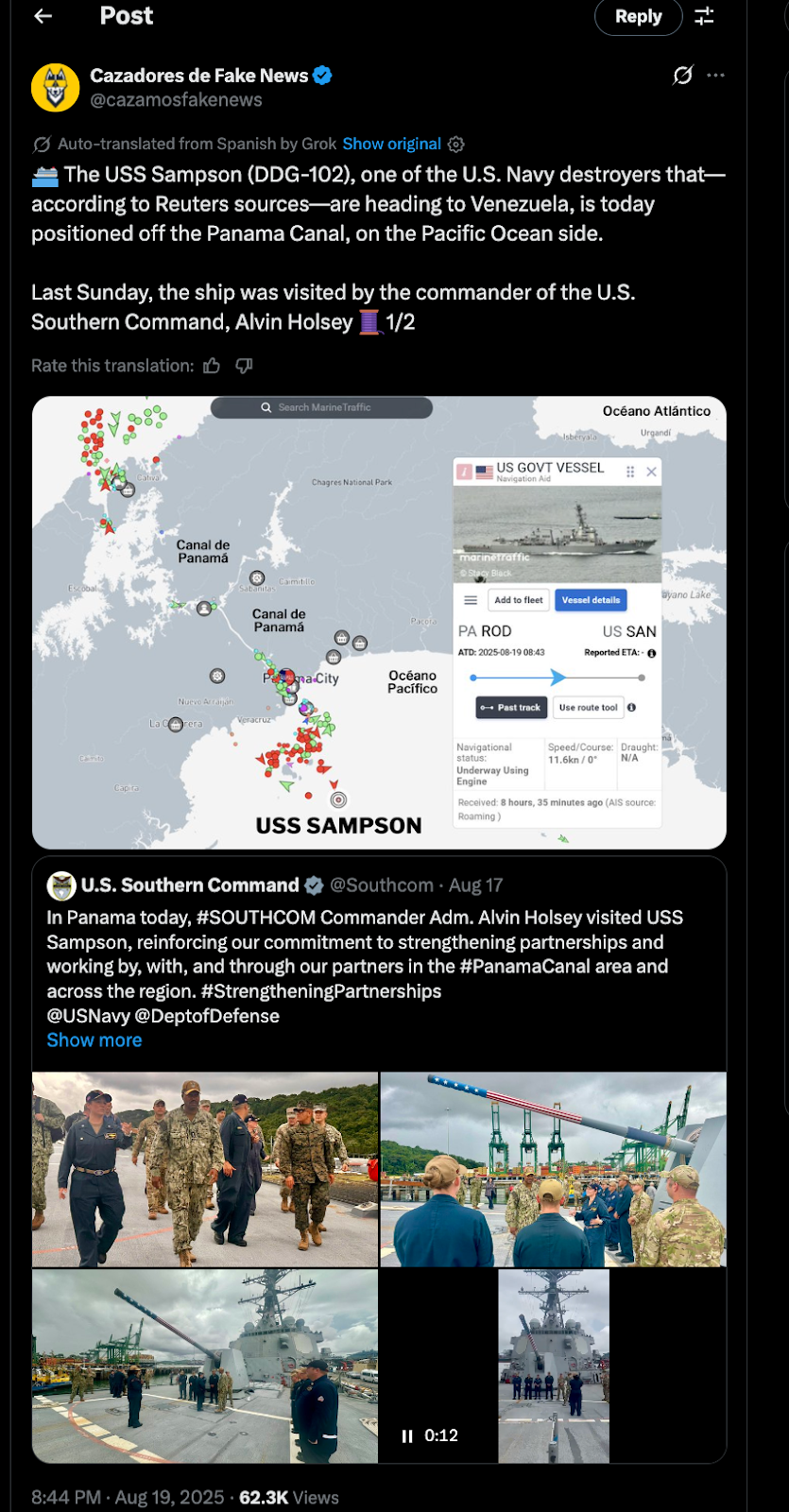 El sitio de verificación de datos venezolano Cazadores de Fake News, miembro de LatamChequea igual que Factchequeado y El Toque, realizó una investigación con herramientas abiertas de geolocalización de embarcaciones que permitió conocer las últimas posiciones declaradas de las naves.