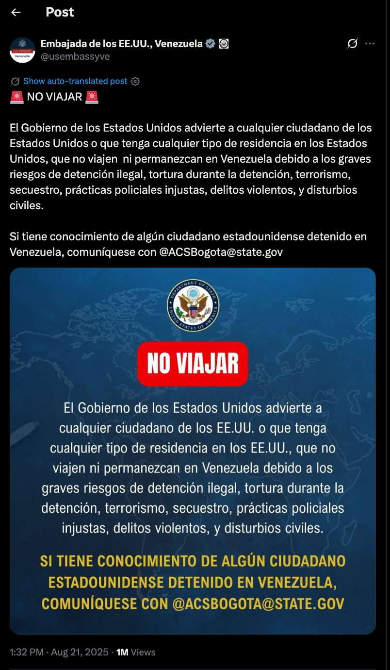 Karoline Leavitt, secretaria de Prensa de la Casa Blanca, dijo el 18 de agosto de 2025 que “el presidente Trump ha sido muy claro y consecuente. Está dispuesto a utilizar todos los recursos de su poder para detener la entrada de drogas a nuestro país y llevar a los responsables ante la justicia”; y reiteró que la postura del Gobierno estadounidense es que Maduro “no es un presidente legítimo”.