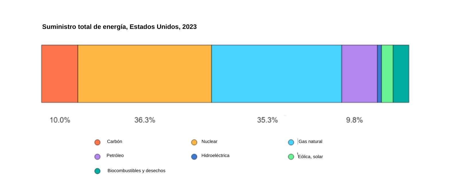 El mix de generación de electricidad es el que mostramos en la siguiente imagen de la Agencia Internacional de la Energía. En 2023, el suministro total de energía en Estados Unidos estuvo dominado por fuentes fósiles, representando el petróleo un 36.3% y el gas natural un 35.3%, seguidos por el carbón con un 10.0%. La eólica y la solar suponen un 3% de la generación. Por tanto, en el caso de que no hubiera viento, el país cuenta con otras fuentes para aportar energía a todos los hogares conectados a la red.