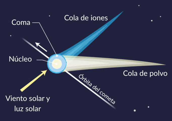 Anatomía de un cometa y sus principales componentes. NASA / JPL-Caltech, con traducción al español de Maldita.es.
